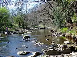 The River Derwent is a river which flows between the historic county boundaries of Durham and Northumberland in the north east of England. It broadens into the Derwent Reservoir, west of Consett. The Derwent is a tributary of the River Tyne, which it joins near the MetroCentre near Gateshead. The river flows for 35 miles from its origin, where two streams, Beldon Burn and Nookton Burn meet approximately a mile west of Blanchland, to Derwenthaugh where it flows into the River Tyne. On its journey, the river flows through places such as Allensford, Shotley Bridge, Blackhall Mill and Rowlands Gill. The Derwent Walk Country Park at Rowlands Gill is named after the river.