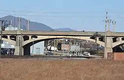 The Roanoke River and Railroad Historic District is a predominantly industrial area on the north side of the Roanoke River in Roanoke, Virginia. The area is bounded by South Jefferson Street on the west and the Roanoke River to the east, and extends north as far as Albemarle Avenue. The district's resources are defined primarily by their relationship to the railroad tracks that bisect this area. The area was developed in the late 19th and early 20th centuries with the completion of the Roanoke & Southern line in 1892 and the Virginian Railway line in 1909, and consists primarily of functional industrial buildings that were built between about 1900 and 1930, an example of which is the Virginia Can Company (built in 1912, listed on the National Register of Historic Places in 2006).[2][3] Notable exceptions are the Virginian Railway Passenger Station, a Spanish Revival passenger station built 1909-10 and listed on the National Register of Historic Places since 2003, and the Walnut Street and Jefferson Street bridges, completed in 1927 and 1928, respectively. Both bridges were constructed in the Art Deco style and designed with "Egyptian Babylonian" style decorations.[2]