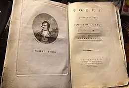 Dugald Stewart commented that Burns was keeping "not very select society". He meant that Alexander Cunningham, Peter Hill, Robert Ainslie and others in Burns's circle, while respectable, were not of the literati.[11] Ainslie, training to be a lawyer, became a close friend of both Cunningham and Burns;[12] a common enjoyment of wine, women and Burns's songs, together with membership of the Freemasons and the Crochallan Fencibles drew Burns and Ainslie into each other's company in January 1787, and a long friendship was established.[2][13] As a student Ainslie lived at No.6, St James's Square in Edinburgh and his near neighbours were George Thomson the music publisher, the artist John Beugo, the engraver and Alexander Nasmyth the painter, all of whom were more or less closely associated with Burns's career.[12] Ainslie was 21, seven years younger than Burns, when they met.[3] He is listed as a subscriber to two copies in Burns's Poems, Chiefly in the Scottish Dialect of 1787.