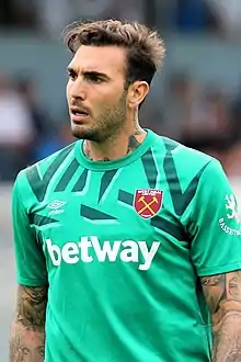 On 31 May 2019, Roberto signed for West Ham United on a two-year deal for a free transfer commencing on 1 July.[35] He made his full debut on 27 August, in a 2–0 win against Newport County in the second round of the EFL Cup.[36] His maiden Premier League appearance took place on 28 September, when he replaced the injured Łukasz Fabiański 34 minutes into an eventual 2–2 away draw to AFC Bournemouth.[37] He retained his place in goal with Fabianski's injury predicted to keep him out for up to two months,[38] and several of his performances attracted criticism after he was deemed to be at fault for goals by Everton, Sheffield United, Newcastle United and Burnley, the latter where he pushed the ball into his own net for the opposition's third goal in a 3–0 victory.[39][40][41][42] Following yet more poor form he was dropped to the bench, with third-choice David Martin playing the fixture against Chelsea on 30 November.[43] In February 2020, former team manager Manuel Pellegrini blamed the player's form as part of the reason for his sacking the previous December.[44]