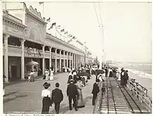 The Board of Estimate appropriated $500,000 for the first connecting section of the boardwalk between Beach 91st and 109th Streets in mid-1927.[53] That August, contractor Muccini & Decker reported that between 30 and 40 buildings in the boardwalk's path would have to be condemned and demolished.[54][55] The contractor subsequently stated that work would progress even as the buildings were to be razed. The existing boardwalk at Hollands and Seaside, between Beach 90th and 100th Street, would be removed and replaced.[56] Work began in September 1927,[57] although the first pile was driven that November.[58] By then, some $4 million had already been spent for shore protection and beach widening.[59] The first section was dedicated in June 1928,[60] although the portion east of Beach 102nd Street was opened to the public first, while the section west of that street opened in July 1928, except for a small gap at Beach 109th Street.[61] With the opening of this boardwalk section, real estate demand along the shore increased in 1928, while existing resort owners started planning amusement attractions.[62][63] More than $1.5 million was invested in constructing hotels, apartment buildings, and bathing pavilions.[64]