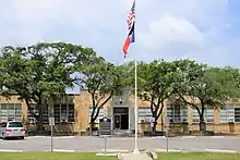 On August 25, 2017 Hurricane Harvey (name now retired)[10] made landfall near the city as a Category 4 storm on the Saffir–Simpson scale.[11] Harvey caused one death and catastrophic damage.[12] One person died in a house fire in the city, unable to be rescued due to the extreme weather conditions,[13] entire blocks were destroyed by the hurricane's violent eyewall winds, the city's courthouse was severely damaged when a cargo trailer was hurled into it, coming to a stop halfway through the structure, the gymnasium of the Rockport-Fulton High School lost multiple walls while the school itself suffered considerable damage,[14] many homes, apartment buildings, and businesses sustained major structural damage from the intense winds, and several were completely destroyed. Numerous boats were damaged or sunk at a marina in town, airplanes and structures were destroyed at the Aransas County Airport, and the Fairfield Inn was severely damaged as well,[15] About 20 percent of Rockport's population was displaced, as they were still unable to return to their homes a year after the hurricane.[16]
