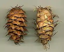 Pseudotsuga menziesii var. glauca, or Rocky Mountain Douglas-fir, is an evergreen conifer native to the interior mountainous regions of western North America, from central British Columbia and southwest Alberta in Canada southward through the United States to the far north of Mexico.[2] The range is continuous in the northern Rocky Mountains south to eastern Washington, eastern Oregon, Idaho, western and south-central Montana and western Wyoming, but becomes discontinuous further south, confined to "sky islands" on the higher mountains in Utah, Colorado, Arizona and New Mexico, with only very isolated small populations in eastern Nevada, westernmost Texas, and northern Mexico. It occurs from 600 m altitude in the north of the range, up to 3,000 m, rarely 3,200 m, in the south. Further west towards the Pacific coast, it is replaced by the related coast Douglas-fir (Pseudotsuga menziesii var. menziesii), and to the south, it is replaced by Mexican Douglas-fir in high mountains as far south as Oaxaca. Some botanists have grouped Mexican Douglas-fir with P. menziesii var. glauca,[3] but genetic[4] and morphological[5] evidence suggest that Mexican populations should be considered a different variety (Pseudotsuga menziesii var. lindleyana).[6]