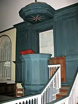 The Church's pulpit is circular in form and positioned above the pews giving the speaker full view of the congregation. Access is gained by a staircase. Above the pulpit is an oval-shaped canopy or sounding board.