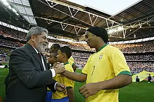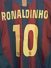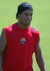 - ↑ "Ronaldinho", the lengthened term of endearment for "Ronaldo", is accompanied in Brazilian usage by the nickname "Gaúcho" (since he hails from Rio Grande do Sul). This was done in order to distinguish him from fellow footballer and countryman Ronaldo or Ronaldo Nazário, who was also known as "Ronaldinho" in Brazil beforehand.[2] Ronaldo Nazário went by his first name upon his move to Europe, thereby allowing Ronaldinho to drop the "Gaúcho" nickname abroad.[3]