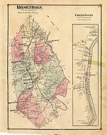 At the time of the European settlement, the region was inhabited by the Lenapes, who were a member of the Algonquian peoples.[3] The area which was eventually known as Rosendale is generally attributed to having been founded by Jacob Rutsen in 1680 from 600 acres purchased from the Lenapes straddling the Rondout Creek. Initially, the land was leased but Rutsen expanded his holdings and built a homestead, in which he resided in from 1700 to his death in 1730.[4] The Town of Rosendale was formed in 1844 from parts of the Towns of Hurley, Marbletown, and New Paltz.