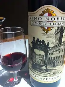 Vino Nobile di Montepulciano is a red wine with a denominazione di origine controllata e garantita status produced in the vineyards surrounding the town of Montepulciano, Italy.[1] The wine is made primarily from the Sangiovese grape varietal (known locally as Prugnolo gentile) (minimum 70%), blended with Canaiolo Nero (10%–20%) and small amounts of other local varieties such as Mammolo. The wine is aged for 2 years (at least 1 year in oak barrels); three years if it is a riserva. The wine should not be confused with Montepulciano d'Abruzzo, a red wine made from the Montepulciano grape in the Abruzzo region of east-central Italy.