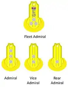 Admiral of the fleet | Admiral | Vice admiral | Rear admiral | Commodore 1st class | Commodore 2nd class | Captain | Commander | Lieutenant | Mate | |||
