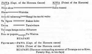 - the first image[2] showing his descent from Pawa, the captain of the Horouta waka and Kiwa, priest of the Horouta, who is also known as the navigator.[3]