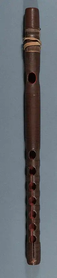 The ryūteki (龍笛, literally "dragon flute") is a Japanese transverse fue made of bamboo.[1] It is used in gagaku, the Shinto classical music associated with Japan's imperial court. The sound of the ryūteki is said to represent the dragons which ascend the skies between the heavenly lights (represented by the shō) and the people of the earth (represented by the hichiriki). The ryūteki is one of the three flutes used in gagaku, in particular to play songs of Chinese style. The pitch is lower than that of the komabue and higher than that of the kagurabue.