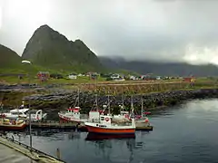 Sørland is a Seaside resort, fishing village and the administrative centre of Værøy Municipality in Nordland county, Norway. It is located on the southern side of the island of Værøya. The village is the main population center of the island, and it is the location of Værøy Church, Værøy Heliport, and Værøy Lighthouse. The village of Nordland lies about 5 kilometres (3.1 mi) to the north and the now-abandoned village of Mostad is located about 5 kilometres (3.1 mi) to the southwest. There are no other villages on the island.