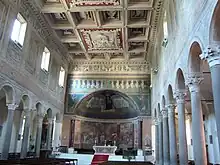 The interior of the basilica retains its 9th century plan, and consists of a nave and two lateral aisles of equal length and separated by 18 granite columns which were spolia from an ancient temple and crowned with Corinthian capitals. The wall above the windows was frescoed by Perin del Vaga, based on designs of Giulio Romano.