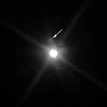 S/2015 (136472) 1, nicknamed MK2 by the discovery team,[2] is the only known moon of the trans-Neptunian dwarf planet Makemake.[1][4][5] It is estimated to be 175 km (110 mi) in diameter (for an assumed albedo of 4%) and has a semi-major axis at least 21,000 km (13,000 mi) from Makemake.[1][6] Its orbital period is ≥ 12 days (the minimum values are those for a circular orbit; the actual orbital eccentricity is unknown).[7][1][5] Observations leading to its discovery occurred in April 2015, using the Hubble Space Telescope's Wide Field Camera 3, and its discovery was announced on 26 April 2016.[2]