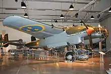 Manned by a crew of three — a pilot and navigator under a glazed, offset canopy, and a bombardier in the nose[2] — the Saab 18 prototype was a mid-wing monoplane with twin vertical stabilisers,[2] and was powered by two Pratt & Whitney R-1830 Twin Wasp radial engines.[2] Armament consisted of three 13.2-millimetre (0.52 in) machine guns, one fixed firing forwards and controlled by the pilot, the others being in flexible defensive mounts for use by the navigator and bombardier.[1] Up to 1,000 kilograms (2,200 lb) of bombs could be carried in an internal bay, while up to eight 50-kilogram (110 lb) bombs could be carried on underwing hardpoints.[1]