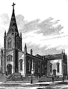 The parish school was established in 1859 in a frame building that was first used as the parish rectory.[3] This building was enlarged for more classroom space and for living quarters for the Sisters of Charity of the Blessed Virgin Mary who began teaching in the school in 1861. In the school's early years there was usually a layman who taught the older boys in addition to the Sisters. Among them was M.V. Gannon who would go on to become an attorney of some merit.[32] A new brick school building was built between 1870 and 1871.