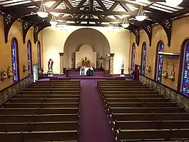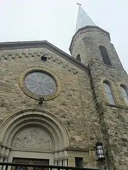 The history of Sacred Heart Church and Catholicism in Sharon, Pennsylvania begins in the early 1850s, when the first Catholic settlers moved to the Shenango Valley area. These first settlers attended services in Mercer, Pennsylvania and Hickory Corners, now located in Hermitage, Pennsylvania. The priests who were in charge of the services at Hickory Corners held the occasional service at the homes of early Catholic families in Sharon. The occasional services continued in this manner until the arrival of Reverend John J. O'Keeffe, who is considered to be the first resident pastor in Sharon.[1] Father O'Keeffe commissioned the building of a pastoral residence, located south of where the current church is. One of the rooms within residence was used as a church until the mid-1860s, when it was decided that a proper church should be built. In 1864, the cornerstone of Sacred Heart Church was laid in a ceremony, on a lot that was donated by J.M. Irvine, on the corner of State Street and Irvine Avenue on the West Hill of Sharon.[1] It was the first Catholic church in Sharon. After a few additions, most notably the bell tower in 1867,[2] the basement was used as a parochial school until a dedicated school building was built in 1889. The first teachers in the parish were the Sisters of the Holy Humility of Mary.[3] In 1892, the church purchased the Peter Kimberly mansion and the land surrounding it, which is located across from the church.[2] Portions of this parcel were sold as building lots for new homes, which gave the church $10,000. After the purchase of the Kimberly Mansion, the Sisters of the Holy Humility of Mary left after they had failed to establish a foundation in the Diocese of Erie that was requested by the Bishop Tobias Mullen. They were replaced by the Benedictine Sisters of Erie,[3] who occupied the mansion.[2] A new brown-brick rectory was built on Irvine Avenue in 1900. During the Great Depression, in 1932, a $75,000 improvement program was announced for the church. This program included an extensive alteration to the front of the church and vestibule(including the addition of the current stonework on the church), new ceilings, new windows, a new sanctuary, a new sacristy, and the conversion of the basement into a social center with two dining rooms, a new kitchen, updated restrooms, and a furnace room. Also, the rectory was enlarged and remodeled. in 1935, Reverend James Murphy was appointed the pastor of Sacred Heart Church, and was named a monsignor in 1947. In 1958, Father Murphy broke ground on a new $450,000 parochial school south of North State Line Road, on the land of the former John Stevenson estate, which the church had purchased, along with the mansion. The new school opened in 1959 with 550 students enrolled. With the new and more modern educational facility opened and a greater need for parking, the former school was razed. If it were around today, it would be located in the current church parking lot. In 1970, Father Murphy retired and Father Donald Scully was named pastor. A fire broke out in the church in 1977. However, the swift action of the Sharon Fire Department kept the damage to a minimum.[2] Because of declining enrollment, Sacred Heart School held its last classes in 1984.[2][3] When fire destroyed the neighboring First Methodist Church in 1987, the school was used as a church until they could build a new one.[2] In 1995, Father Daniel Kresinski took over as pastor. In May 1997, the school was sold to the Brookfield Local School District,[2][3] where it operated as Brookfield Elementary School until a new schooling complex was built in 2011. As 2001 rolled around, Father Kresinski was reassigned to another parish and was replaced by Father Stanley Swatcha. Father Swatcha was reassigned to another parish and was replaced by Father Henry Andrae in 2008, who made many attempts to revitalize the parish.