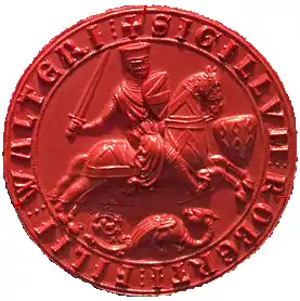 In 1215, when the baronial rebellion broke out, Robert Fitzwalter became the military commander, and the Earl of Winchester joined him, acting as one of the chief authors of Magna Carta and negotiators with John; both cousins were among the 25 guarantors of the Magna Carta.[5] De Quincy fought against John in the troubles that followed the sealing of the Charter, and, again with Fitzwalter, travelled to France to invite Prince Louis of France to take the English throne. He and Fitzwalter were subsequently among the most committed and prominent supporters of Louis's candidature for the kingship, against both John and the infant Henry III.[6]