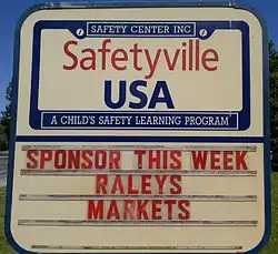 Safetyville, USA is part of the non-profit[1] Safety Center, Inc.'s Children's Safety Program, which provides life-saving safety skills and awareness education. The one-third scale town features real sidewalks, crosswalks, streetlights, a police, fire and sheriff station, and businesses commonly found in any city, including McDonald's and Taco Bell.[2][3] In June 1998, Dick Cable, a professional broadcaster for KXTV and News10 of Sacramento, became the Honorary Mayor of Safetyville. Cable was the first Sacramento broadcaster to win an Emmy award.[4]