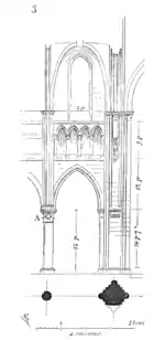The abbey church was built at the request of Agnès de Baudement,[2] wife of Robert I, Count of Dreux,[2] according to the plans of Andre de Baudement. It is distinguished by the tympanum of the central portal, which has been saved. This was restored behind the current facade. With four bays, the nave joins the transept by a remarkable lantern tower rising to 33 metres (108 ft). The plan of the apse has an excellent and rare disposition. Some of the sculptures of the portal are deposited in the museum of Soissons .