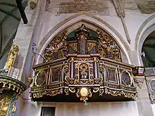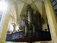 On the side chorus there is another organ in the Renaissance - early Baroque style from the second half of the 17th century. It is located in the main sanctuary of the Renaissance chorus. It is decorated with eared ornaments and statues of angels. Sill of the organ body is polygonal and there are images with scenes of the Annunciation, the Birth and Adoration of three Kings placed. The inside of the body contains 378 pipes of different sizes. Whistles of prospectus are original. The way of painting the biggest decoration is remarkable. It is wrapped with leaves and tassels. Nowadays it is an unused tool. It is important to realize that only the cabinet and pipes which are disconnected and partially damaged are original. The inside of the instrument is Tucek’s organ, op. 299 with outlet tube and a romantic disposition. The organ has been reconstructed at the same time as the reconstruction of major organ by the same company in the 1920s.