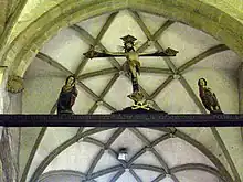 There is a Late Gothic portal on the south side. Its lining is richly profiled and crossed in the peak. The portal area is decorated with blind flamboyant tracery. It leads into the southern stellar vaulted hall, which was built in 1509. Another church portal is on the north side. It is smaller and it has retained its original Gothic carved door from the 15th century. It leads to spiral staircase finishing in the oratory on the second floor. The original main Gothic portal was rebuilt and reduced in the late 18th century. The decoration of "coins" ornaments was placed into the lining of reduced portal.