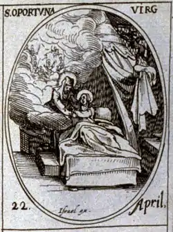 ![]() Opportuna being visited by the Virgin on her deathbed, engraving by Jacques Callot (c. 1630) | |