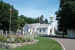 The monument to Alexis Landry was replaced by a stone monument unveiled in 1961 by French writer Henri Queffélec.[29] A replica of the chapel as it existed before 20th-century renovations were built in the 1970s at the Village Historique Acadien Provincial Park,[18] a tourist site near Caraquet that recreates life from 1770 to 1939 using some forty buildings and costumed interpreters. In 1975, a public toilet was built on the site, while the interior of the chapel was restored.[6] In 1984, four pilgrims walking toward the Bocage were killed in Paquetville.[30] Stones were installed on the banks of the park in 1996 to protect it from increasing erosion.[31] The chapel was renovated and enlarged in 1999.[15] It became a municipal historic site on November 1, 2006.[32] On July 26, 2004, to mark the 400th anniversary of Acadia, Cardinal Marc Ouellet celebrated a mass attended by more than 10,000 people.[33] A monument commemorating the Great Upheaval was unveiled on July 28, 2007.[34] The spring was rebuilt in 2011 after a storm.[35]