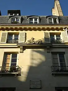 The façade of cut stone is shown in an engraving from Blondel's book and in the original plans conserved in the archives of the Comédie-Française. It consisted of 7 bays of 3 storeys and an attic with a mansard roof. On the ground floor, in the outer two bays on each side were four doors opening to the interior. The central three bays, topped with a triangular pediment and flanked with rusticated pilasters, formed a grand avant-corps.[8] A high relief sculpture of the goddess Minerva by Étienne Le Hongre decorated the tympanum (interior of the pediment). Le Hongre's sculpture survives, mounted in a similar location on the façade of the current building and declared a monument historique on 29 March 1928.[9] Below the pediment were the Arms of France sculpted in low relief, and below that, at the level of the main floor, a decorative medallion inscribed with the words "Hotel des Comédiens ordinaires du Roy entretenus par Sa Majesté M.D.C.LXXXVIII [Home of the regular Actors of the King supported by His Majesty 1688]".[10] An iron balcony ran along the entire facade, and on the ground floor in the outer bays of the avant-corps were two ticket windows.[8]
