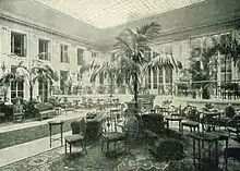 A palm court is a large atrium with palm trees, usually in a prestigious hotel, where functions are staged, notably tea dances. Examples include the Langham Hotel (1865),[1] Alexandra Palace (1873), the Carlton Hotel (1899), and the Ritz Hotel (1906), all in London; and the Alexandria Hotel (court added in 1911) in Los Angeles, Palace Hotel, San Francisco, Britannia Hotel in Trondheim and the Plaza Hotel in New York City. Capitalizing on their popularity, some ocean liners also had palm courts, notably the RMS Titanic (1912).[2]
