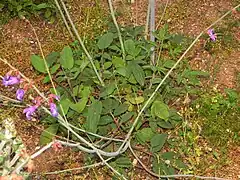 Salvia ringens forms a basal clump of pinnately divided leaves, typically less than 1 foot in height and width. The leaves are dark green with a grayish cast, with petioles and stems that stand out with a wine color. From summer through autumn the plant produces tall (2 foot) flowering stems with two to four flowers at the top, in widely spaced whorls. There are only a few stems at any given time. The 1.5 inch violet-blue flowers are very showy and large, held in a small calyx covered with hair and glands. The specific epithet, ringens, refers to the wide open two-lipped flowers.[1]