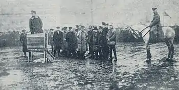 ![]() The regiment's commander speaking from a makeshift tribunal in the middle of a field | |