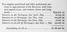 Henry Varnum Poor (1860)[8] explained in more details, that on the 16th of Aug., 1859, at the suit of the Fourth Mortgage Bondholders for the foreclosure of this mortgage, a Receiver was appointed to take charge of the road and its effects. He was directed to pay, in the first place, all arrearages due employees of the road; also for supplies used in operating it; also all other charges incident to its protection and maintenance, and to hold the net earnings subject to the order of the Court. There were received by him from earnings and other sources, up to 1st Jan., 1860, $2,424,452. The payments in the meantime were as follows:[8]