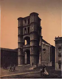 The church was erected at the site of the old Royal Alcázar of Valladolid and designed originally in Gothic style; although the façade, with its gate-tower shape, was designed in 1569 in a Renaissance-influenced style by Rodrigo Gil de Hontañón. Originally, the towers flanking the entrance were considerably taller, but these were shortened in the 19th century due to concerns about their structural integrity.