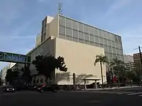 The fourth county courthouse was completed in 1961 across the street from where the Hall of Justice now stands.[4] The stained glass windows were saved from the 1892 building, but were not installed into the 1961 Courthouse; instead, the windows were placed in the Hall of Justice, completed in 1996. The 1961 courthouse sat on the active Rose Canyon Fault and required asbestos abatement, prompting its replacement.[6]