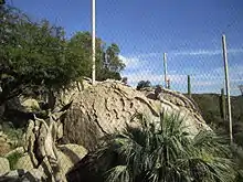 Opened in October 2004, Lion Camp houses the park's six African lions, Izu, Mina, Oshana and Etosha in a 1-acre (0.40 ha) exhibit.[27] The park's two other lions, Ernest and Miss Ellen, were moved to the San Diego Zoo. One side of the enclosure is dominated by an artificial rock kopje which has a 40-foot-long (12 m) glass viewing window and heated rocks.[27] The path continues along an acacia-studded ravine and leads to a replica observation tent. This has a smaller viewing window as well as a Land Rover for the lions to rest on.