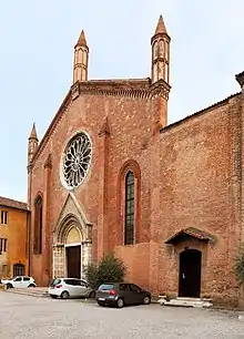 The church was founded by the Franciscan Order in 1304 but it was not consecrated until 1459, when Pope Pius II performed the ceremony.[1] Suppressed in 1782, it was sacked in 1797,[1] during the Napoleonic Wars, and turned into an arsenal in 1811. Still in military use when World War II began, it was devastated by bombardment during the war. The Cappella Gonzaga, with its frescoes depicting the life of St. Louis of Toulouse ( Italian: San Ludovico d'Angiò ), was saved and recently restored. These frescoes were supposed to have been painted by Serafino de' Serafini,[1] an artist who was active in Modena during the 14th Century. The church was reconstructed in Romanesque and Gothic styles. Now visible are some of the original frescoes depicting St. Francis Receives the Stigmata by Stefano da Verona. Andrea Mantegna's work St. Bernardino of Siena between Two Angels was originally here but it is now at the Pinacoteca di Brera in Milan, Italy.