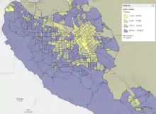 San Jose's position in Silicon Valley triggered further economic and population growth. Results from the 1990 U.S. Census indicated that San Jose surpassed San Francisco as the most populous city in the Bay Area for the first time.[30] This growth led to the highest housing-cost increase in the nation, 936% between 1976 and 2001.[73] Efforts to increase density continued into the 1990s when an update of the 1974 urban plan kept the urban growth boundaries intact and voters rejected a ballot measure to ease development restrictions in the foothills. As of 2006, sixty percent of the housing built in San Jose since 1980 and over three-quarters of the housing built since 2000 have been multifamily structures, reflecting a political propensity toward Smart Growth planning principles.[74]