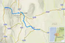 From Calingasta the river flows eastwards feeding the Los Caracoles, Punta Negra and Quebrada de Ullum Dams (Embalse Quebrada de Ullum) located near San Juan city, from which it continues south-eastwards receiving a few more tributaries, including the Mendoza River, to later join the Desaguadero River near the Salina Pampa de las Latas (or Salina Bermejo), at the common border of the provinces of San Juan, Mendoza and San Luis.