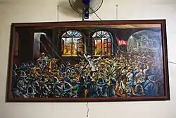 The church is the site of the Battle of San Rafael, a battle fought between Filipino revolutionaries under the leadership of General Anacleto “Matanglawin” Enriquez against the Spanish army headed by Commandant Lopez Arteaga.[3] On their way from the town of Paombong, Bulacan to the mountain ranges of Bulacan, General Isidoro Torres of Malolos decided to divide the troop of Katipuneros into two: one group under his supervision while the other under the guidance of General Enriquez and his brother Colonel Vicente Enriquez. The group of General Enriquez was supposedly heading to the town of Baliuag, Bulacan but decided to stay instead in San Rafael, believing it to be a strategic site. Unknowingly, a Spanish troop from Manila heading towards San Rafael, prepared to silence the 20,000 Filipino insurgents. The battle started at around 7 a.m. on November 30, 1896. The Spanish forces were so strong that General Enriquez ordered a retreat to the church of San Rafael. Sometime in the middle of the battle, some of the Filipino troops including Colonel Enriquez were separated from the rest of the group and headed to the town of Bigaa (now Balagtas). At around noon, the Spanish army forced the church doors open and murdered the Filipino revolutionaries seeking shelter in the church. It is estimated that 800 people were killed in the battle, most of whom were children, women and other locals. The number of casualties was so immense that it was believed that blood spilled in the church reached ankle-deep.[1] The gobernadorcillo of San Rafael ordered a mass grave to be made near the church.[4] It is believed that the Battle of San Rafael inspired the young general Gregorio Del Pilar (a close friend of General Anacleto Enriquez) to join the revolution against Spain.[3]