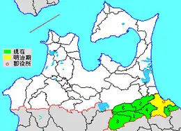 The Nanbu clan sided with the Ōuetsu Reppan Dōmei during the Boshin War of the Meiji Restoration and were punished by the new Meiji government by loss of their northern territories. In November 1869, large portions of Kita-gun (Shimokita and Kamikita) and Sannohe District became part of the newly created Tonami Domain (斗南藩, Tonami-han), a 30,000 koku holding created to resettle the dispossessed Matsudaira clan from Aizu-Wakamatsu. In July 1871, with the abolition of the han system, Tonami Domain became Tonami Prefecture, and was merged into the newly created Aomori Prefecture in September 1871.
