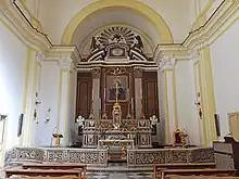 Before the war, the main altarpiece by Francesco la Mura depicted a Glory of St Vincent de Paul. Among the chapels, was a canvas depicting a Holy Family, St. Jeanne de Chantal with St Vincent de Paul (1758) by Severino Galante. The church also had works by Giovanni Sarnelli. All were destroyed in a bombing in 1943. The marble sculpture of the Immaculate Conception (1858) on the facade was made by Francesco Liberti and Giuseppe Pirotti.[2]