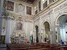 Among the interior decorations are a number of paintings from the school of Solimena. Next to the sacristy is an altarpiece depicting St Matthew by Antonio Pascucci. The canvases in the second and third chapels on the right, depicting Madonnas with Saints Francis and John the Baptist, and with Saints Anthony and Phillip were painted by Nicola de Mattheis. The third chapel also has a canvas depicting the Resurrection by Paolillo, a pupil of Andrea di Salerno. The first chapel on the right has a St Anthony by the school of Massimo Stanzione.[1]