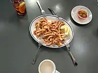 Some typical dishes from the city of Santander are the fried calamari called rabas, double donuts, bean stew called cocido montañés, and seafood dishes ranging from seabass and sardine to products such as morguera.