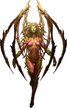 Kerrigan's infestation by the Zerg signaled a major overhaul for her appearance. Despite maintaining her stature, build, and facial features, she is described in Queen of Blades as having mottled green skin, covered in a glossy protective carapace. Kerrigan's eyes are bright yellow as opposed to her natural green, and her hair has transformed into stalks, described as being segmented like an insect's legs.[23] Kerrigan's fingers are stated to now contain extendible claws.[24] A pair of skeletal wings has also grown from her back, consisting of elongated segmented spikes that reach down to the level of her knees.[25] Kerrigan is seen using these wings as a melee weapon, tearing opponents apart.[26]