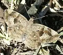 The wingspan is 36–38 mm for males and 38–40 mm for females. The upper surface of the wings are variegated brown and grey.