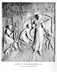 Within the Monument are 188 steps that connect five levels and a viewing platform at the top. Upon the walls of the first two levels are 16 bronze bas relief plaques depicting dramatized scenes of the American Revolution. Other interior decorative items include ornamental ceramic tile, brass moldings, stained glass and terracotta cornices.[1]