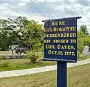 In 2021, management of the site where the British Army surrendered was transferred to the National Park Service.[4][5] The Saratoga Surrender Site Memorial Park marks the precise location where British General John Burgoyne surrendered his army to General Horatio Gates on October 17, 1777.[4] The 19-acre park is located nine miles north of the Saratoga Battlefield Park, and a half mile south of Schuylerville on U.S. Route 4.[4] The park includes explanatory plaques and signage, and two cannon.