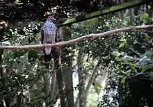 The scaled pigeon is fairly common in semi-open forest. It builds a stick platform nest in a tree and lays two white eggs.