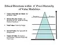 8) Pathological Ressentiment ultimately manifests as "Metaphysical Confusion". Metaphysical Confusion is a form of Value Delusion in which the value shift is more vertical in character,[36] in relation to the apriori hierarchy of value modalities. In this dimension, Value Delusion occurs a sort of twisting, or false inversion, of the value hierarchy wherein higher value-contents and bearers are viewed as lower, and lower as higher. Today we commonly refer to this phenomenon as "Having One's Priorities Out of Order." Scheler illustrated such an inversion in his analysis of Western civilizations humanistic, materialistic and capitalistic propensities to elevate utility values above those of vital values.[37][38] Carried to the logical extreme, "Ressentiment brings its most important achievement when it determines a whole "morality," perverting the rules of preference until what was "evil" appears "good".[39]