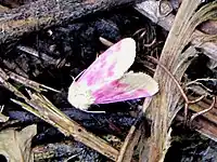 Adults have a pink head and pale yellow to creamy white thorax and abdomen.[2] The forewings are pink with pale yellow markings.[2] The hindwings are creamy white.[2] The wingspan is about 30 mm.[2]